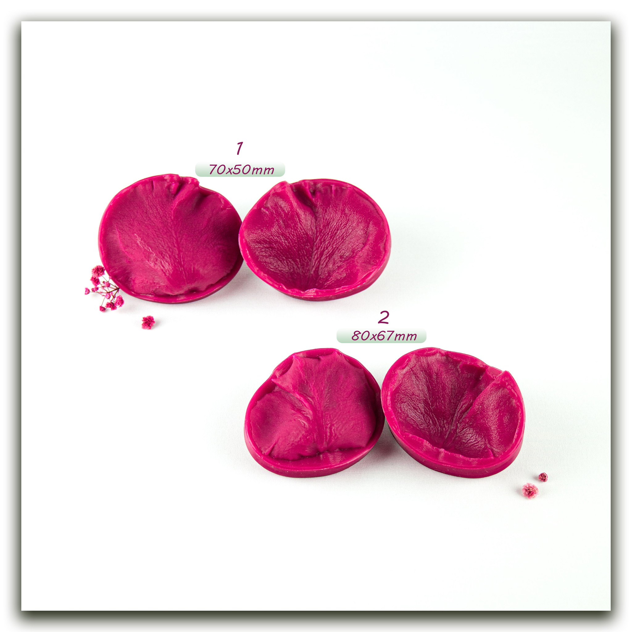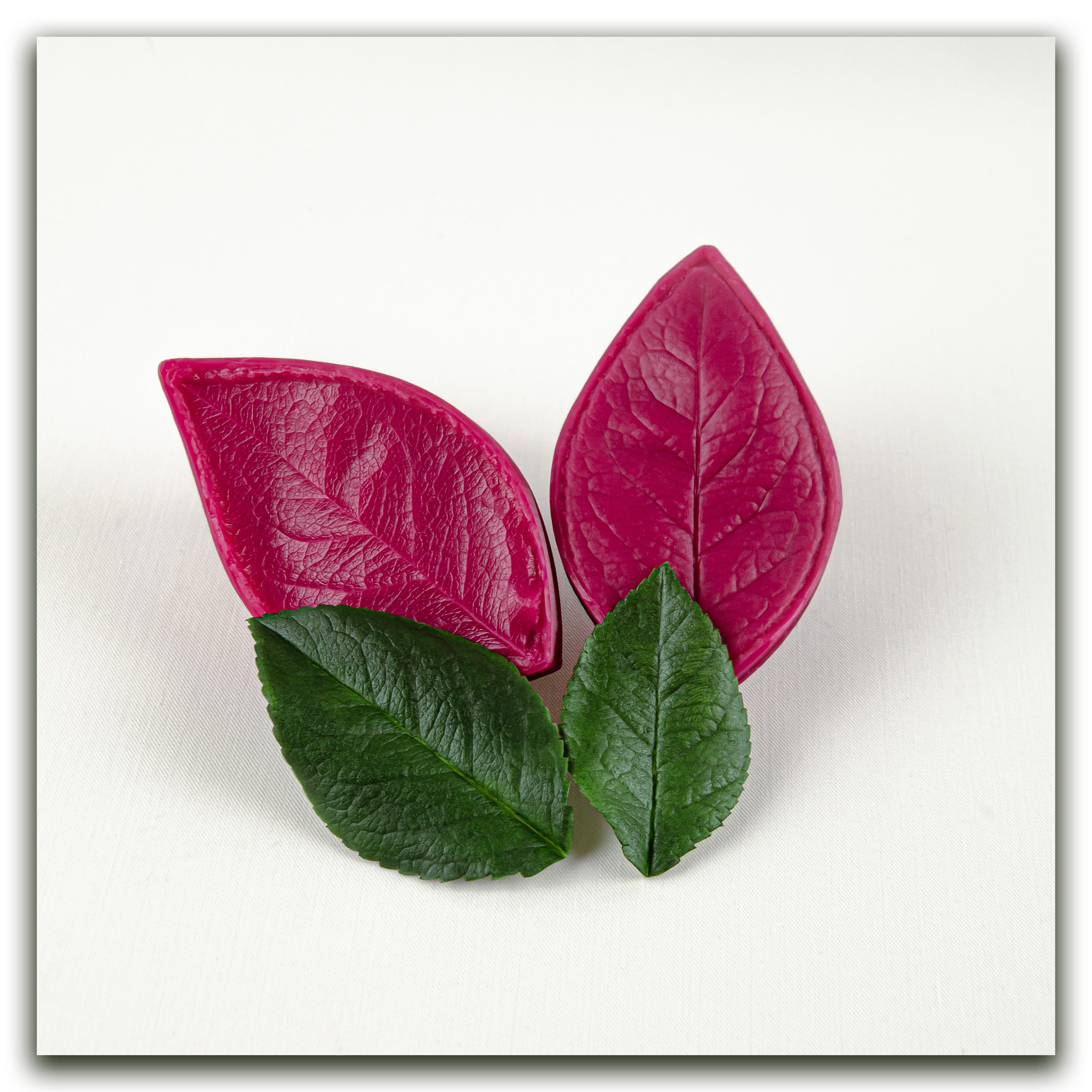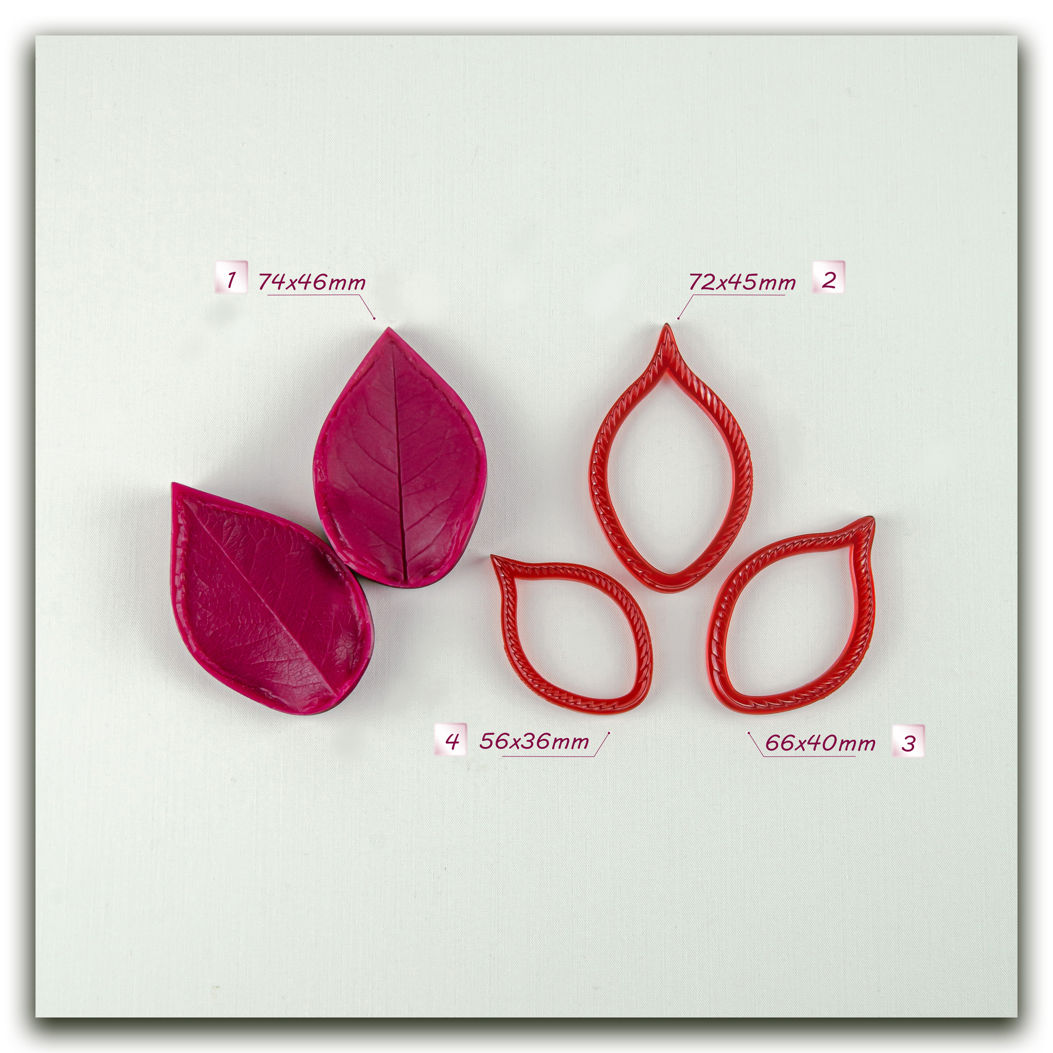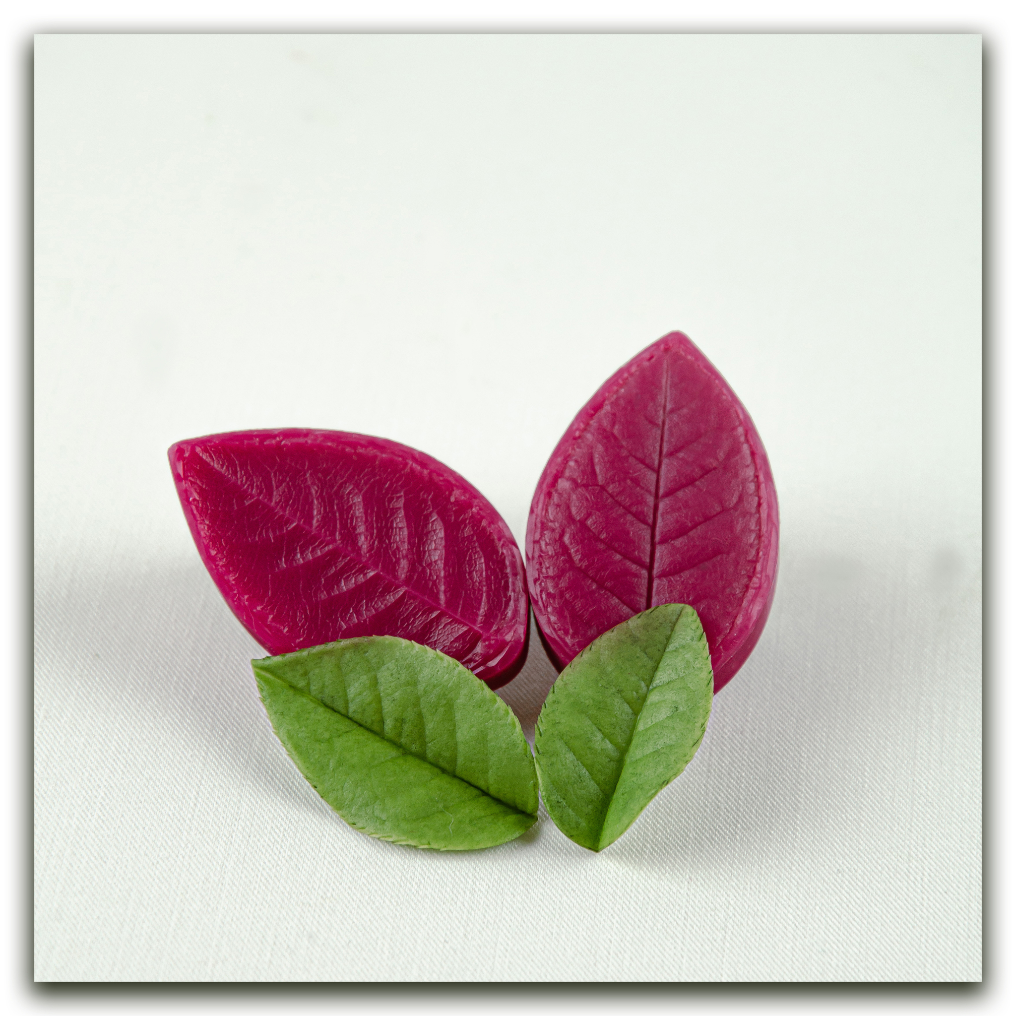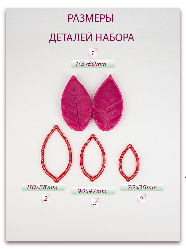 Изготавливаются методом двухстороннего снятия фактур с живого растения, повторяя даже самые мельчайшие изгибы и прожилки, что позволит вам создавать ботанические копии цветов и листьев! Предназначены для работы с холодным фарфором, самоотвердевающей и запекаемой полимерной глиной (не очень жесткой), фоамираном. Вайнеры так же подходят для мастики, шоколада и других масс для лепки.