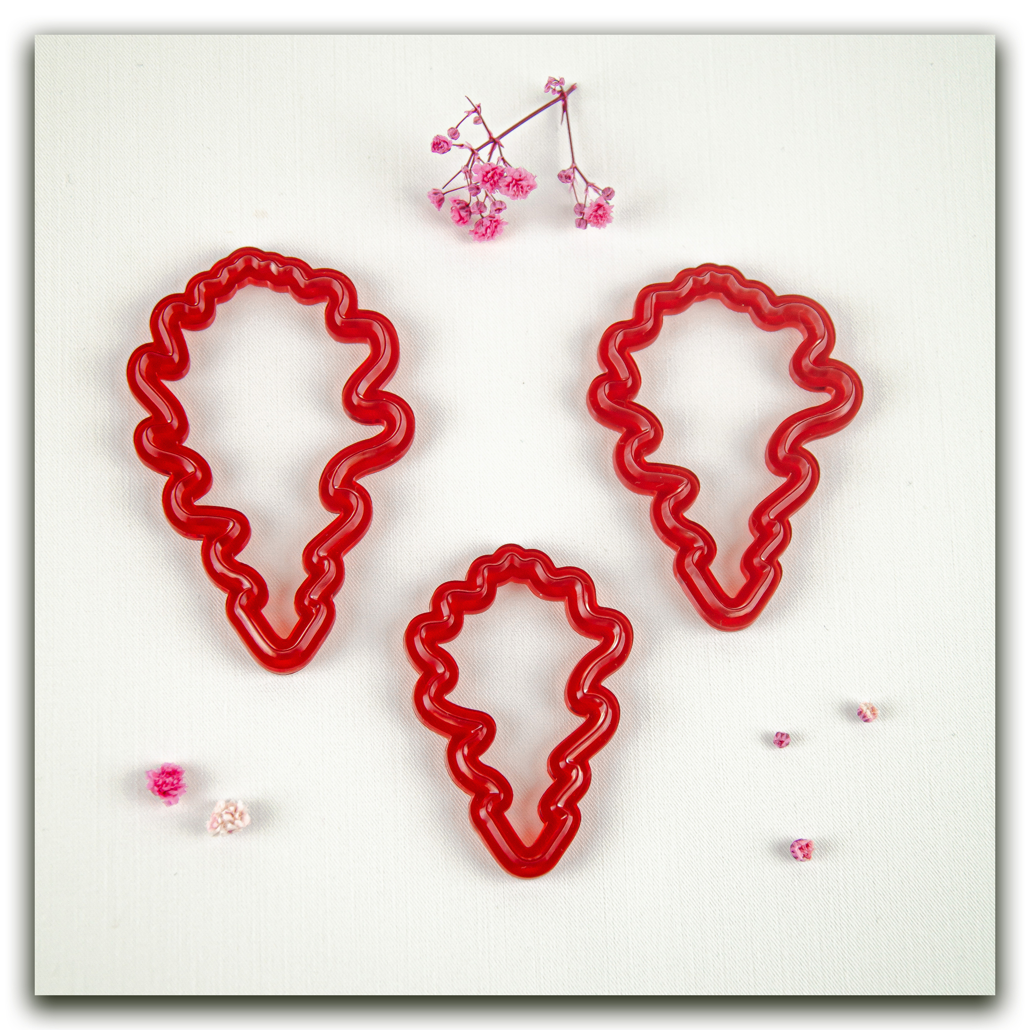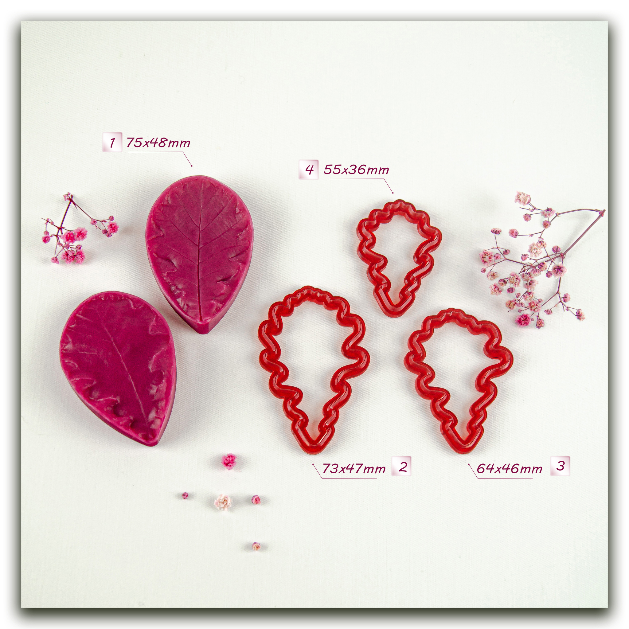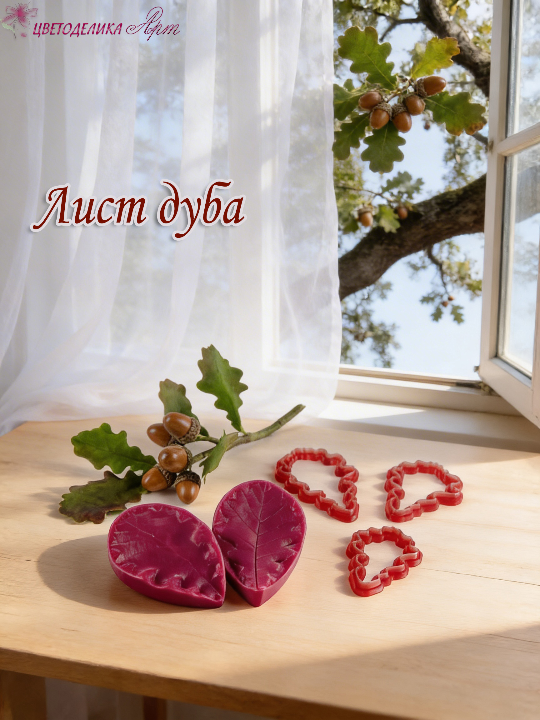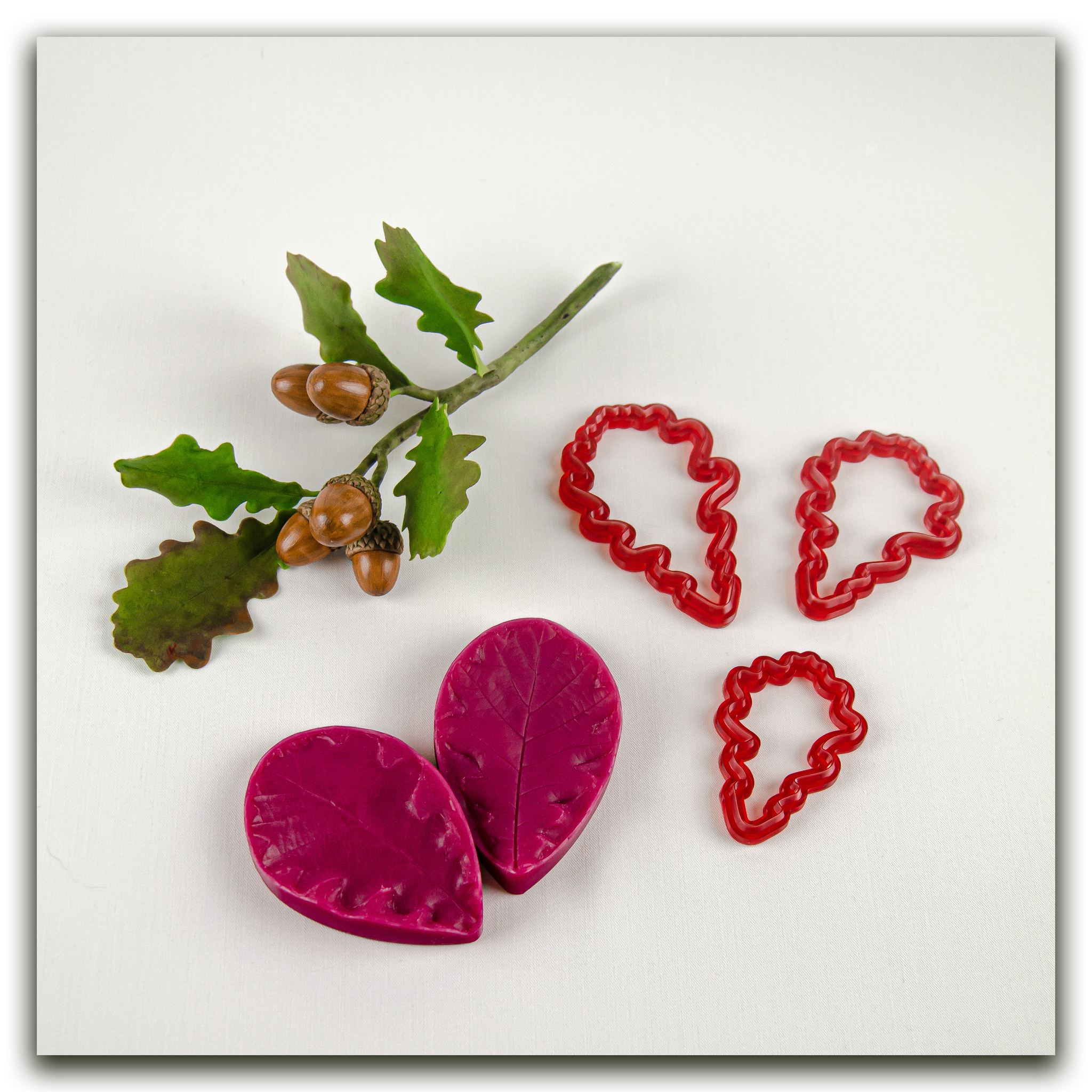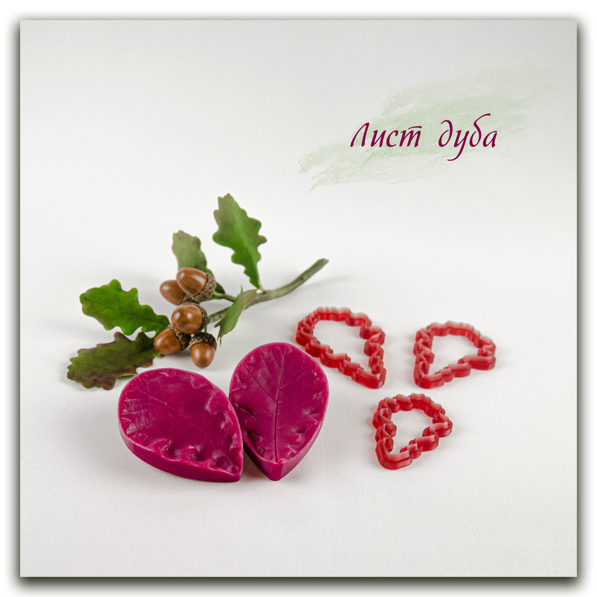 Силиконовый вайнер и набор фотополимерных каттеров разного размера, в точности повторяющие форму листьев дуба.