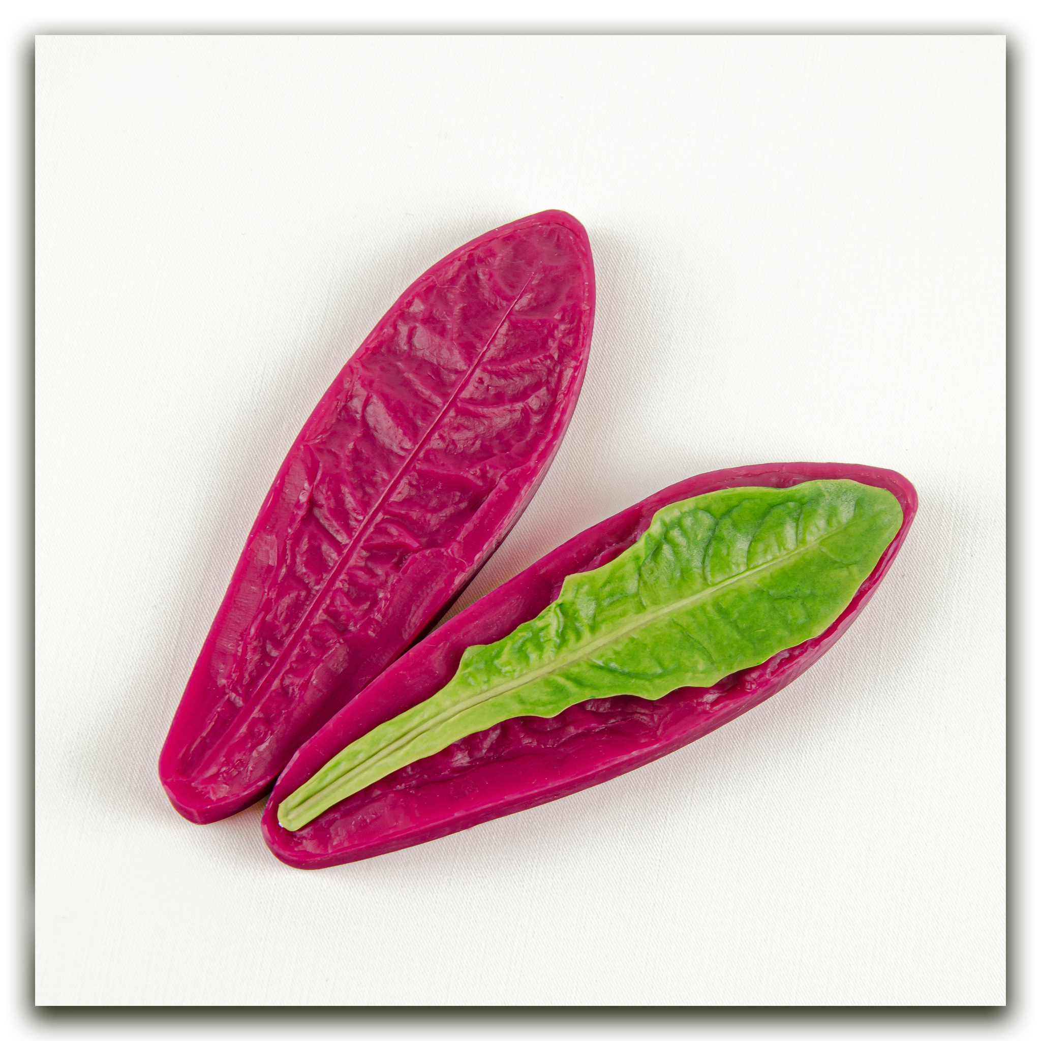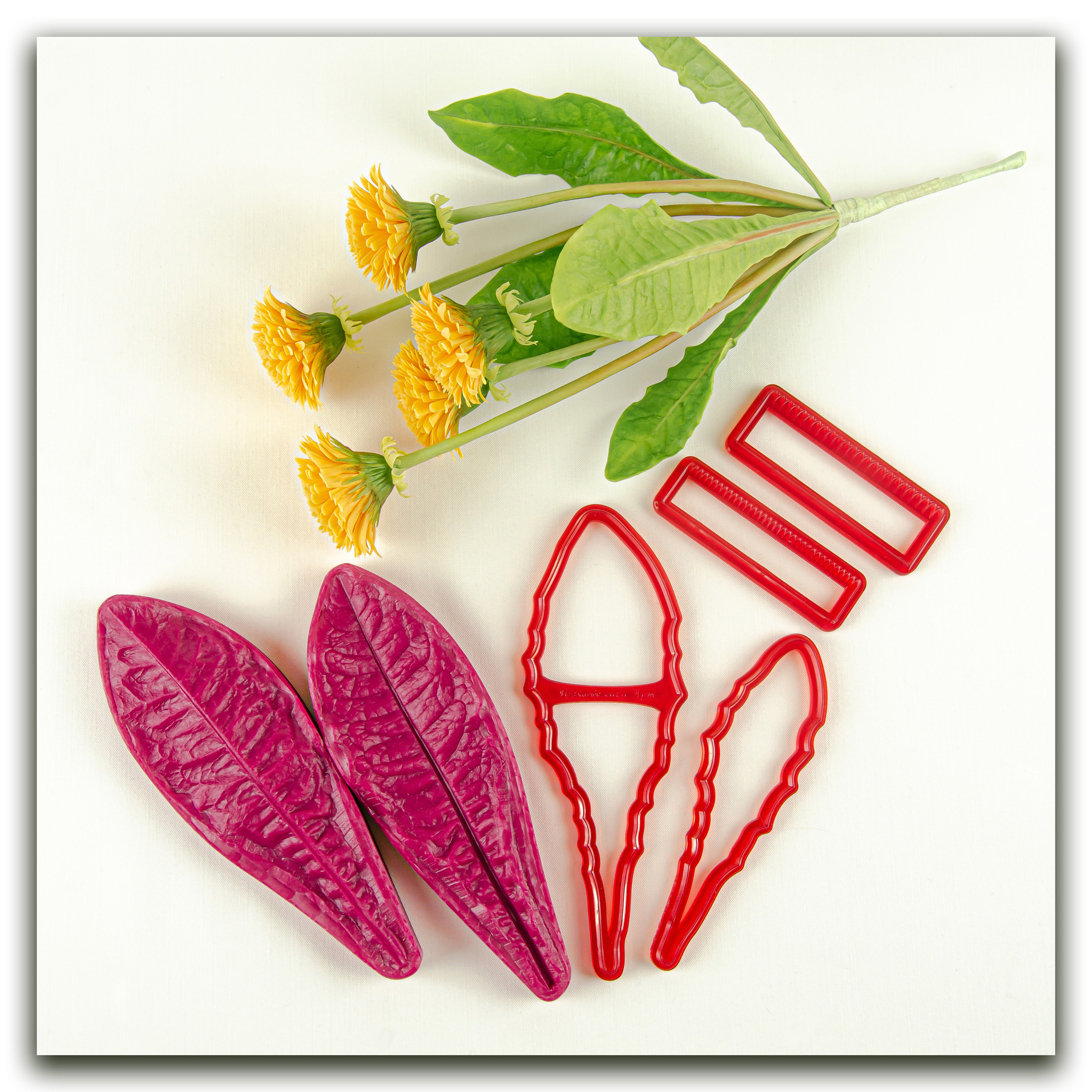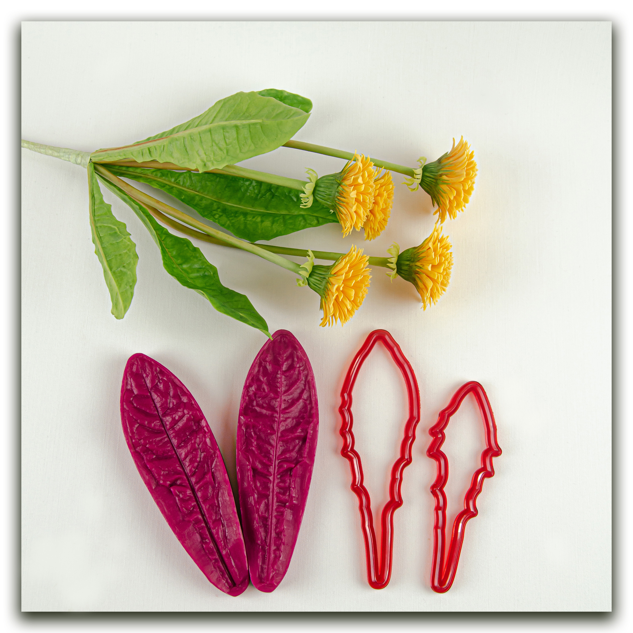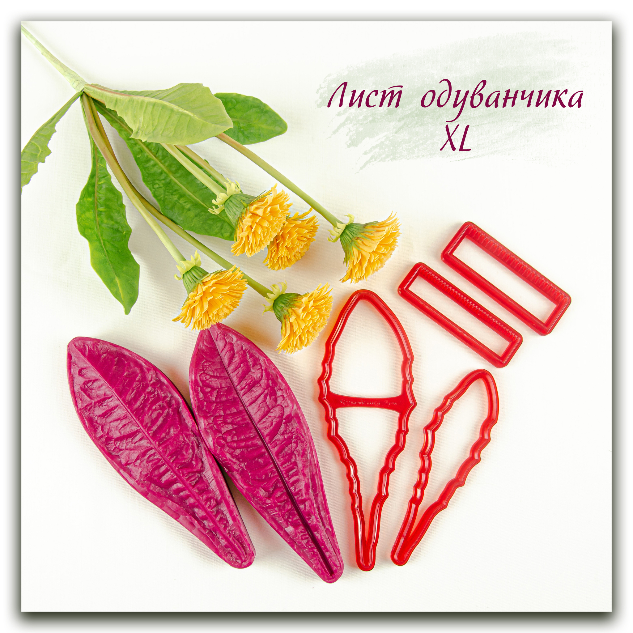 Силиконовый вайнер не очень крупного листа одуванчика, имеет живую двухстороннюю фактуру. Каттеры из фотополимера, повышенной прочности, с тонкой режущей частью, в точности повторяют форму листьев одуванчика, идеально подходят под вайнер.