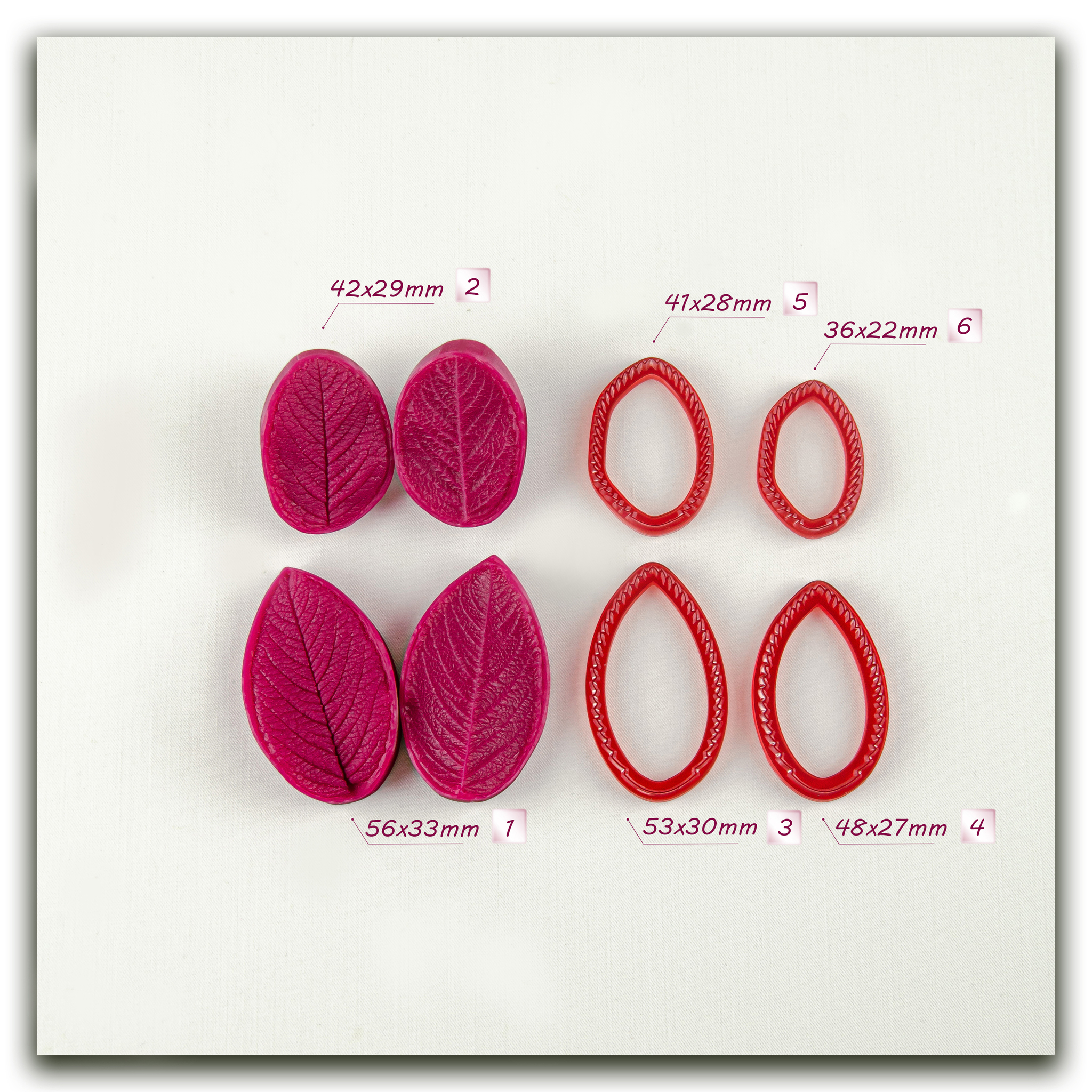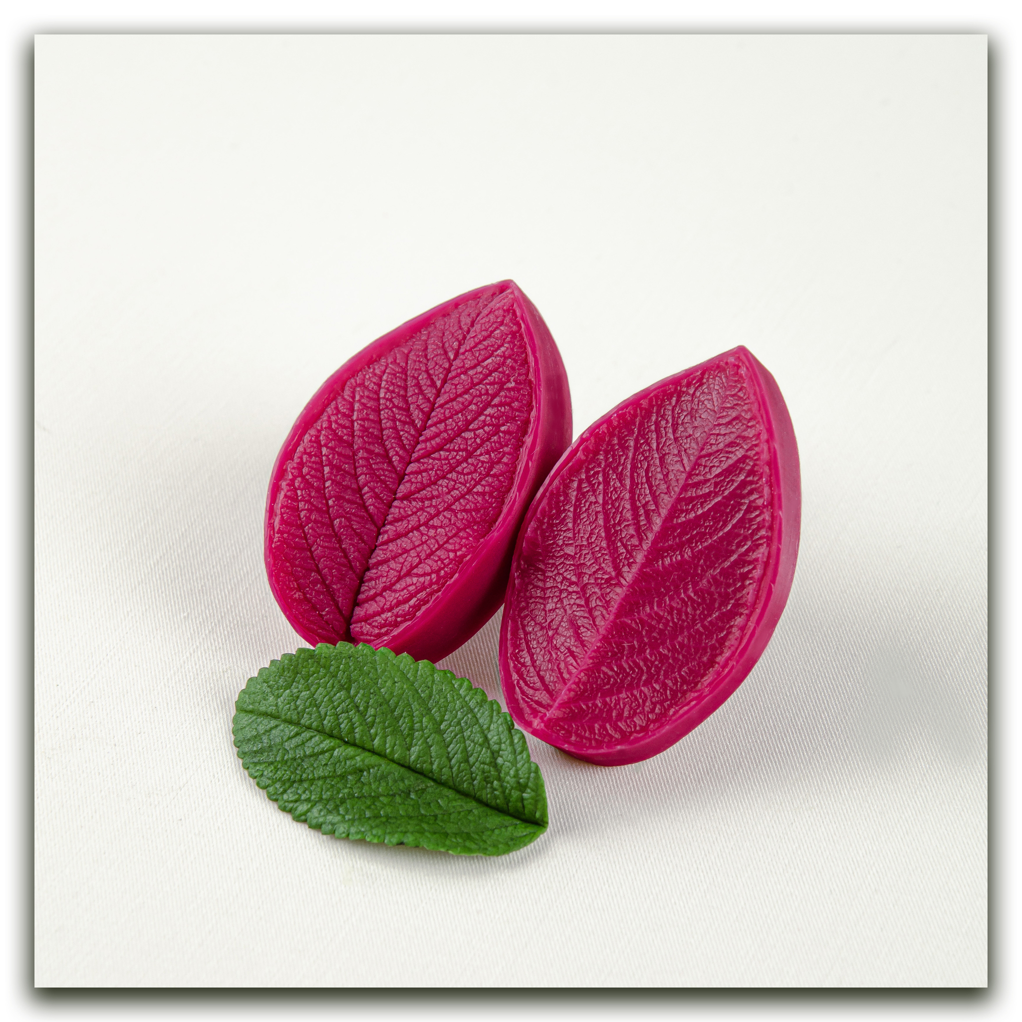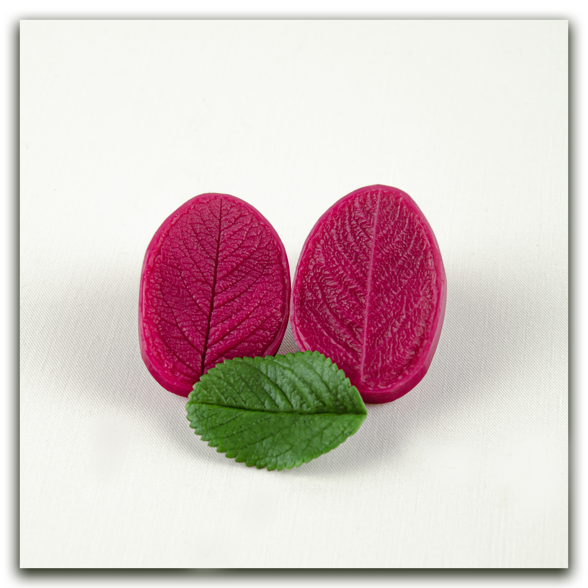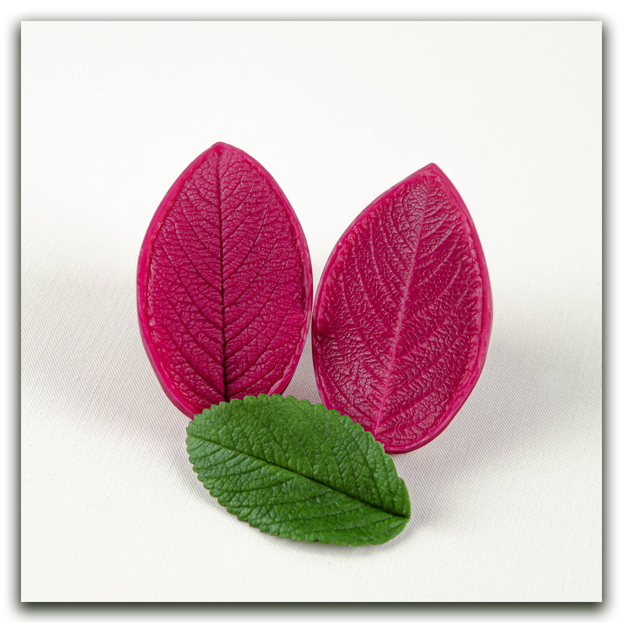 Вайнер из пищевого силикона и фотополимерные каттеры, в точности повторяющие форму листа розы, имеют характерные зубчики, которые вам не придется вырезать вручную. У этого вайнера потрясающая фактура, сложная, ярко выраженная, вся сеточка прожилок четко отпечатывается на материале (в данном случае холодный фарфор). Образец отпечатка вы можете видеть на фото.  Можно приблизить фото и рассмотреть всю сложность узора этого листа! Если вы любите лепить розы, то без такой роскошной зелени вам точно не обойтись! В наборе 1 вайнер и 3 каттера разного размера. Можно заказать весь набор целиком или выбрать детали, указанные цифрами на фото с размерами.