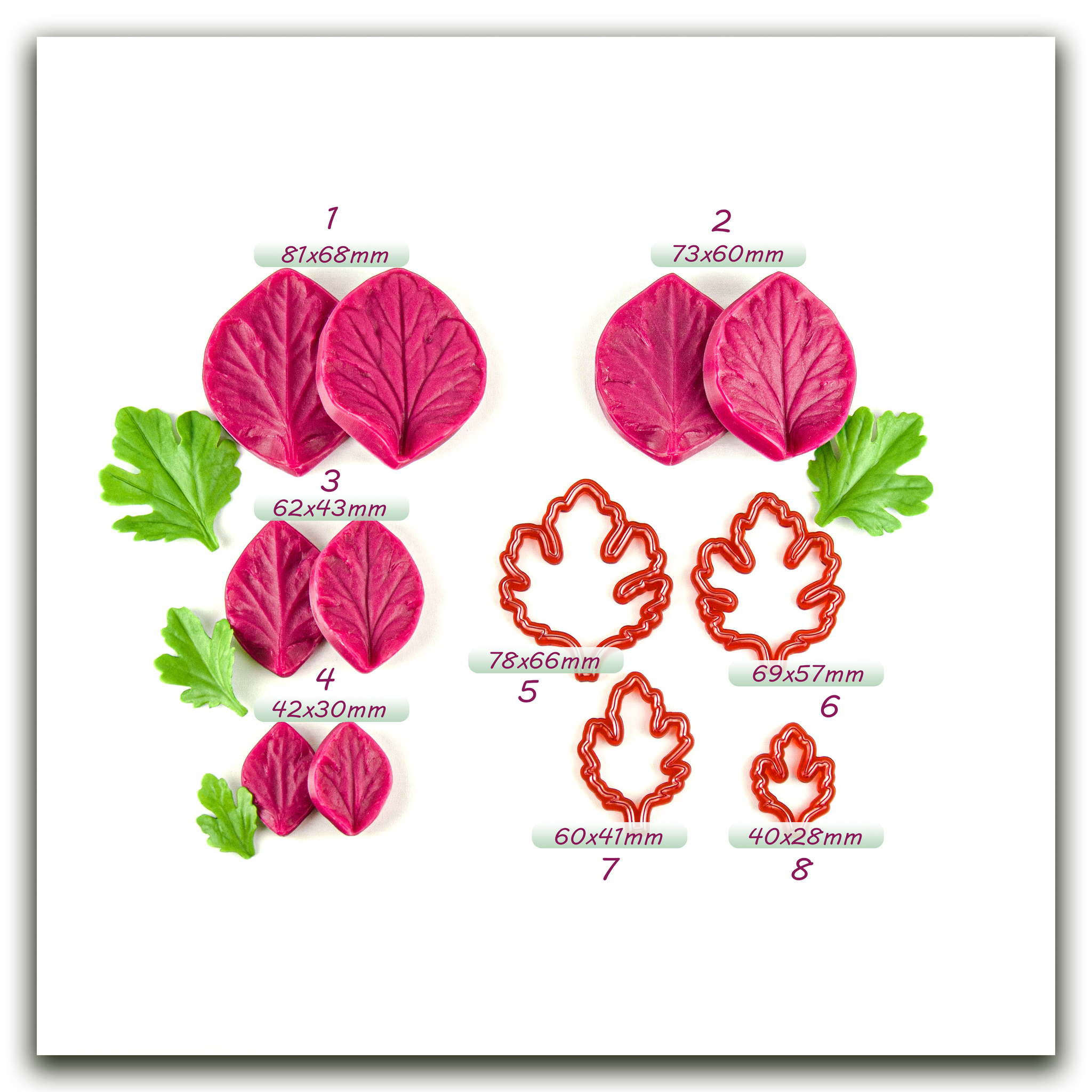 Имеют двухстороннюю фактуру живого растения, повторяя даже самые мельчайшие изгибы и прожилки, что позволит вам создавать ботанические копии цветов и листьев! Предназначены для работы с холодным фарфором,