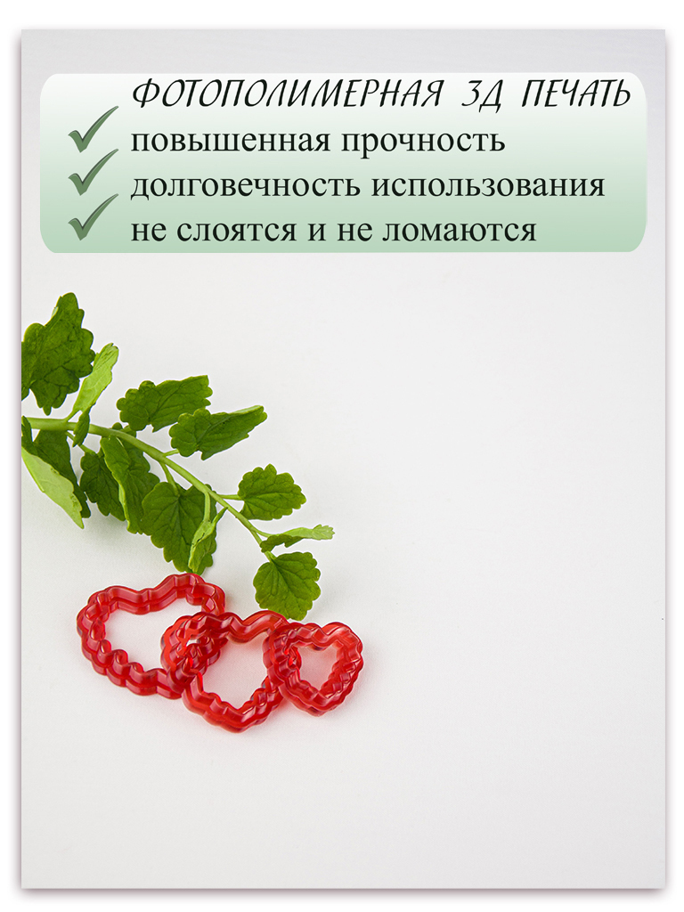 Каттеры идеально подходят по размеру к вайнерам. Изготовлены методом фотополимерной 3D печати, имеют повышенную прочность в отличие от пластика, тонкий режущий край 0.2 мм, что позволяет точно и качественно вырезать формы из глины и других масс.