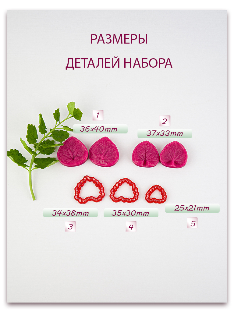 Имеют двухстороннюю фактуру живого растения, повторяя даже самые мельчайшие изгибы и прожилки, что позволит вам создавать ботанические копии цветов и листьев! Предназначены для работы с холодным фарфором, самоотвердевающей и запекаемой полимерной глиной, фоамираном, мастикой и шоколадом, другими массами для лепки.