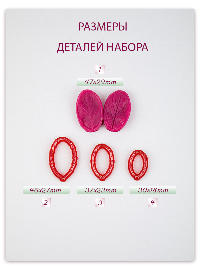 Изготавливаются методом двухстороннего снятия фактур с живого растения, повторяя даже самые мельчайшие изгибы и прожилки, что позволит вам создавать ботанические копии цветов и листьев! Предназначены для работы с холодным фарфором, самоотвердевающей и запекаемой полимерной глиной (не очень жесткой), фоамираном. Вайнеры так же подходят для мастики, шоколада и других масс для лепки.