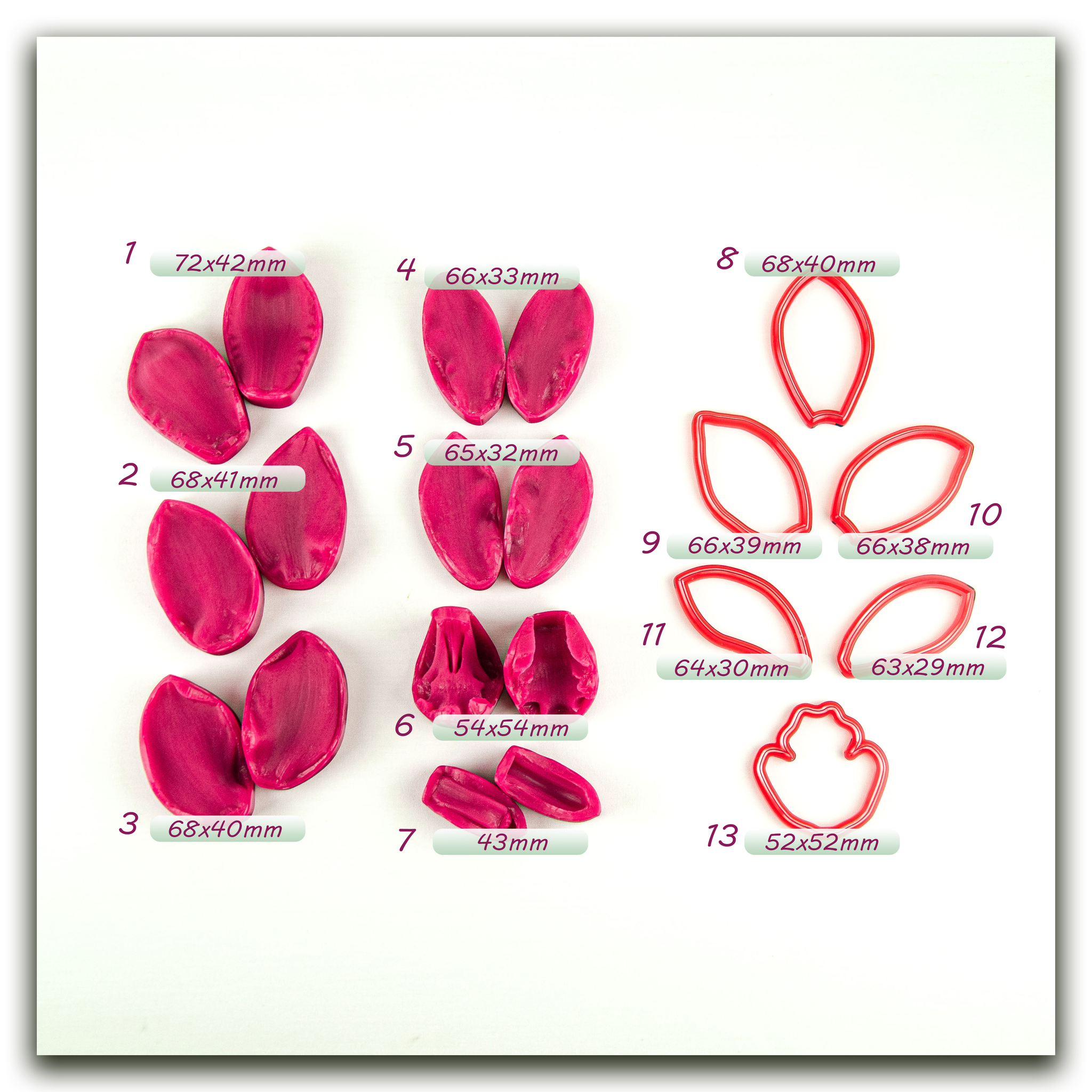 Имеют двухстороннюю фактуру живого растения, повторяя даже самые мельчайшие изгибы и прожилки, что позволит вам создавать ботанические копии цветов и листьев! Предназначены для работы с холодным фарфором,