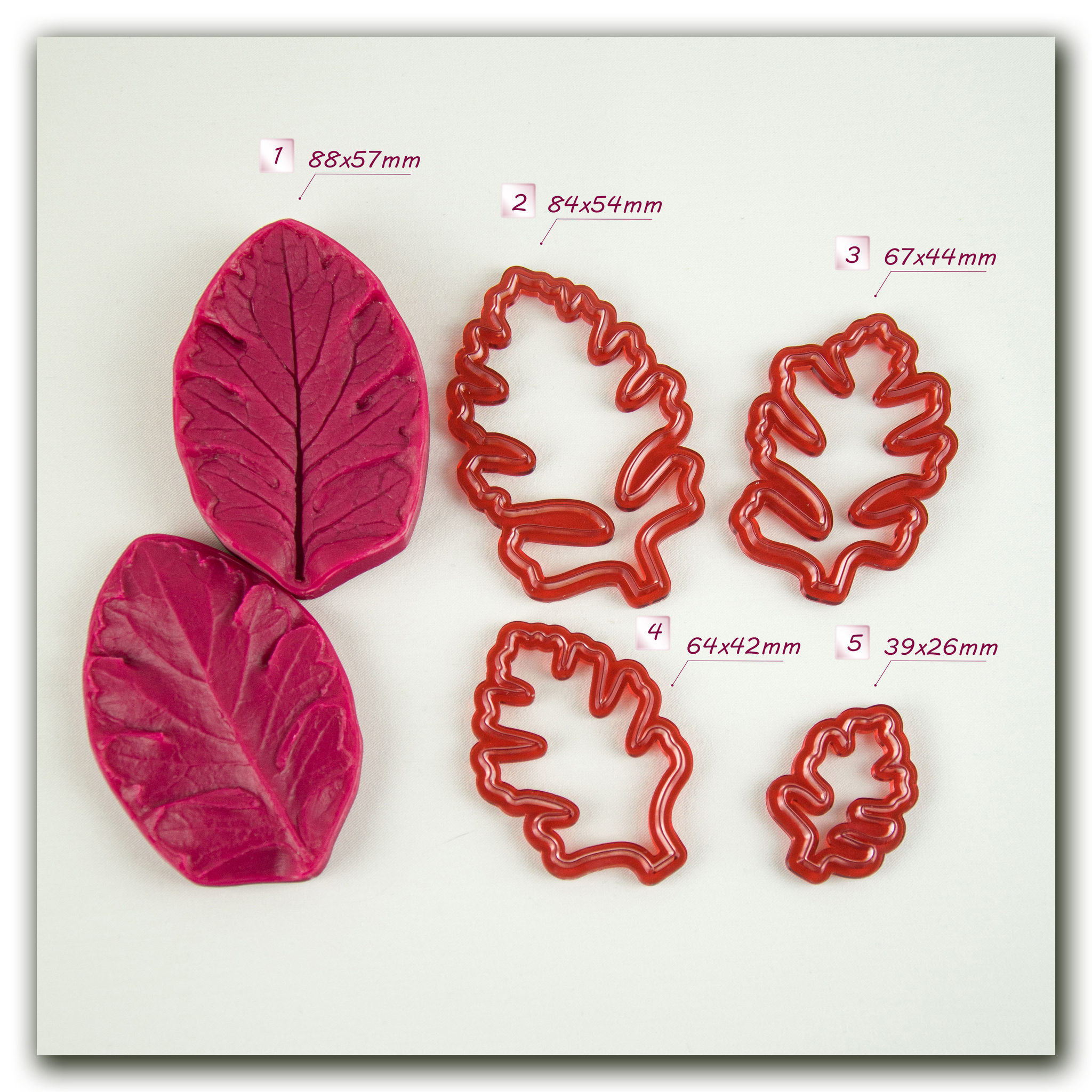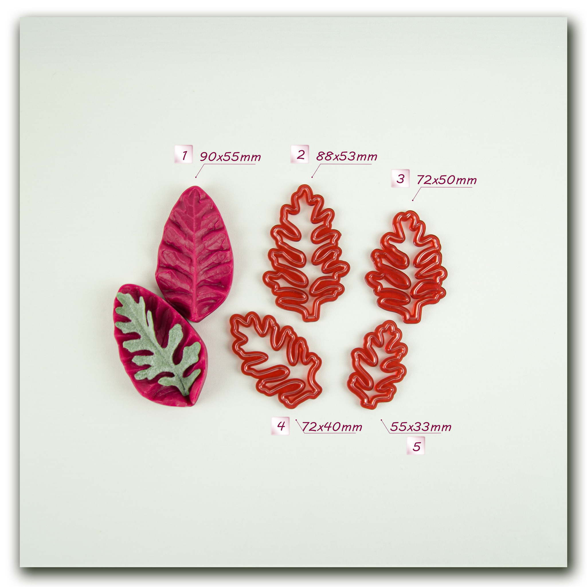Имеют двухстороннюю фактуру живого растения, повторяя даже самые мельчайшие изгибы и прожилки, что позволит вам создавать ботанические копии цветов и листьев! Предназначены для работы с холодным фарфором, самоотвердевающей и запекаемой полимерной глиной, фоамираном, мастикой и шоколадом, другими массами для лепки.